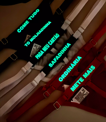 Tanga Fio confeccionada em tule, com alça de regulagem em metal dourado, com escritas sexys que brilham no escuro em plaquinha de silicone.