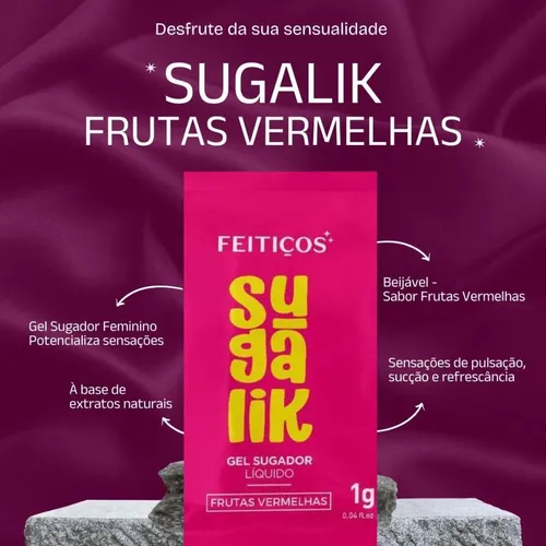 O Sugalik da Feitiços Aromáticos é um gel inovador no mercado de comestíveis eróticos, desenvolvido para proporcionar uma explosão de sensações. Sua fórmula combina ingredientes 100% naturais e veganos, com efeitos de pulsação, sucção e refrescância, podendo ser utilizado tanto por homens quanto por mulheres.